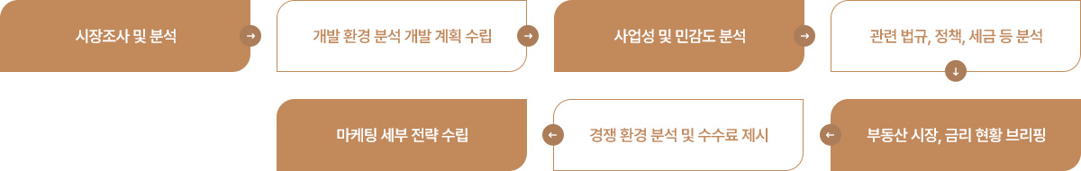 부동산 컨설팅은 차후 준공되는 시점이 다가왔을 때 고객님들의 니즈에 맞게 사후관리를 도와드리며, 실입주 혹은 임대, 매매 등 다양한 이슈에 대해 전문지식과 경험을 가진 전문가를 통하여, 결정권자에게 여러 가지 방안과 해결 방식을 제공합니다. 주로 비주거용 상품들에 한해서만 컨설팅 진행을 하고 있습니다.